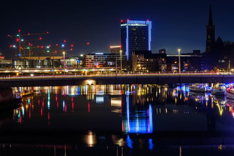 View of the city of Bremen from the Teerhofbrucke. Reflection of Hotel Steigenberger and the Weser Tower in the River Weser. In the foreground is the Burgermeester Smidt bridge, a major thoroughfare to the old town. In the left background, the lights of a large number of construction cranes shine in the harbour area. This photo was…