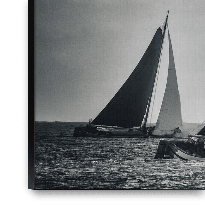 Classic Skutsje sailing ships during the annual Skûtsjesilen championship in Friesland in black and white. Image with a retro vintage look.