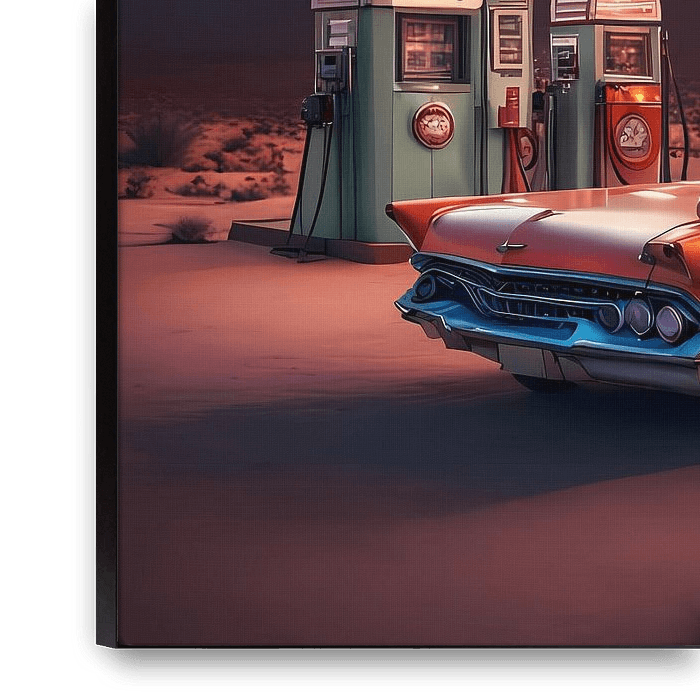 A retro-style petrol pump along Route 66 in the desert with a classic car with neon advertising.