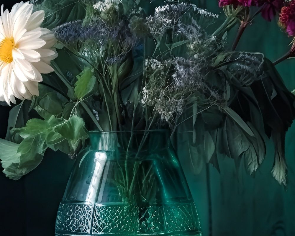 This classic painting shows a mixed bouquet of wild summer flowers in a translucent green glass vase against a dark green background. Painted with realistic colours, the scene exudes a summer atmosphere. This flower still life fits well with a country and classic living style. It is a beautiful and colourful still life that brings nature into your home.