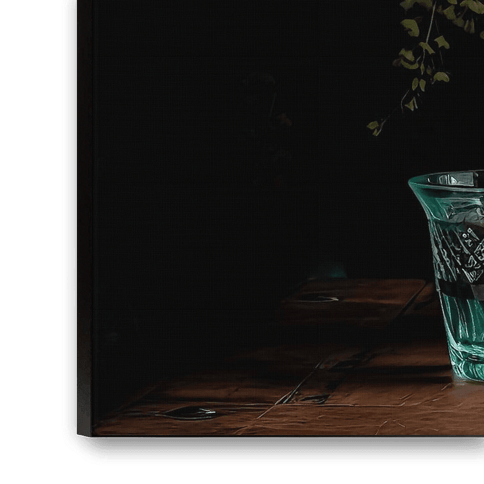 A bouquet of wild summer flowers in white and yellow stand in a green crystal vase against a dark background. There is a lot of contrast. Painted in realistic colours, this classic painting exudes a summer atmosphere. The floral print fits well with a country and classic living style. It is a beautiful and colourful still life that brings nature into your home.