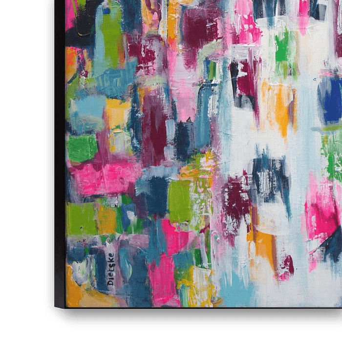 The white vertical plane in the middle represents God's Spirit in the form of living water. This waterfall is a stream in which you are washed clean. When you stay close to God, you receive new life, new eyes and a new heart. He brings out the beautiful colours in you. The colourful squares are us humans. These colours are also seen in the sky and symbolise God's colours. We humans may take on His colour and return to our origins.