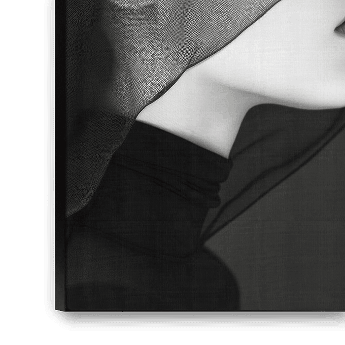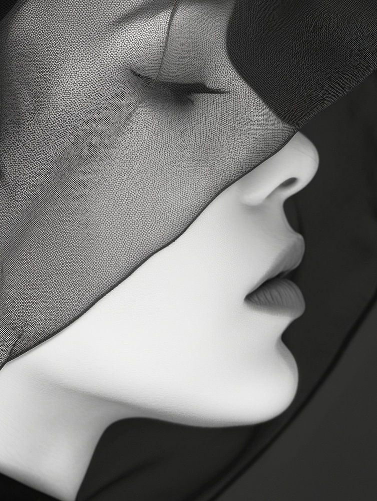 A black-and-white portrait of a woman dressed in see-through fabric. See-through chic.