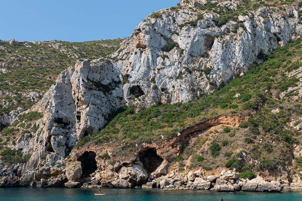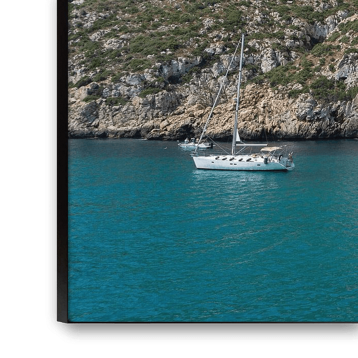 Under a bright blue sky, a steep cliff rises out of the calm sea. Two white boats float on the clear water. Bright sunlight beautifully accentuates the vibrant colours of the Mediterranean coast. The rugged beauty of the limestone cliffs forms a harmonious contrast to the turquoise blue sea water. This photo is inspired by the natural beauty of Cala de la Granadella. The dreamlike bay is a hidden paradise on the Costa Blanca and a perfect place to enjoy the view of the vast coastal landscape.