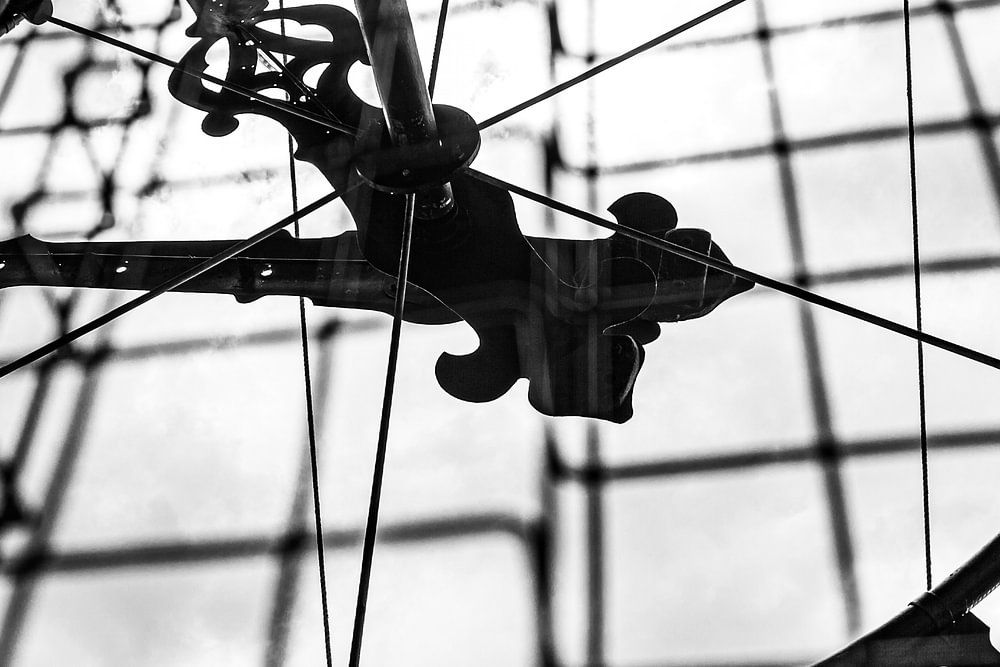 View of the back of one of the clocks of the Martini Tower in the city of Groningen at a height of 70 meters. This photo was taken in the autumn of 2013. In black and white.