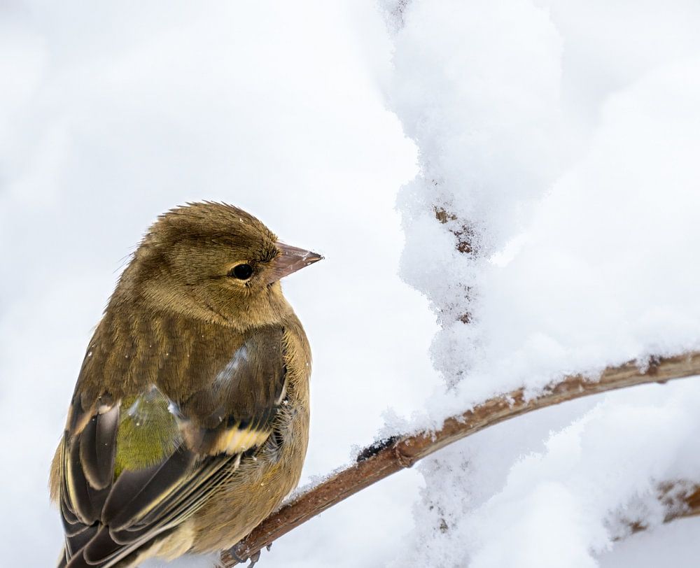 Close-up of a female chaffinch in the snow by ManfredFotos