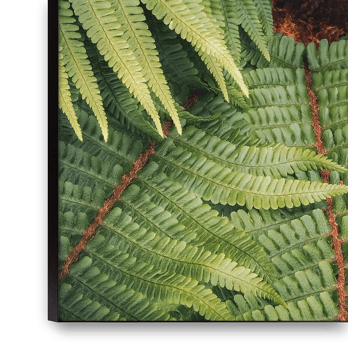 This print shows the quiet beauty of Molecaten Estate in Hattem, Netherlands, up close. A lush fern fills the image, its fan-shaped leaves overlapping each other like a natural mosaic. The fine saw edges catch the summer light, the rust-brown veins subtly draw lines through the fresh greenery. In the centre, a small, dark core opens up,…