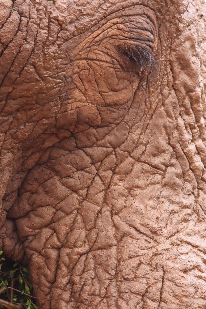Close up of an african elephant eating a branch. Skin wrinkles are clearly visible and a piece of tusk.