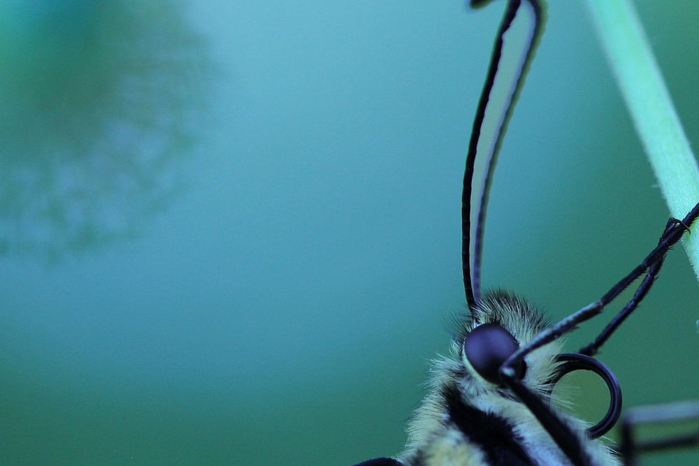 This swallowtail photographed up close, showing the details of its pretty head. In the green background the pretty little flower on which this butterfly hangs.
