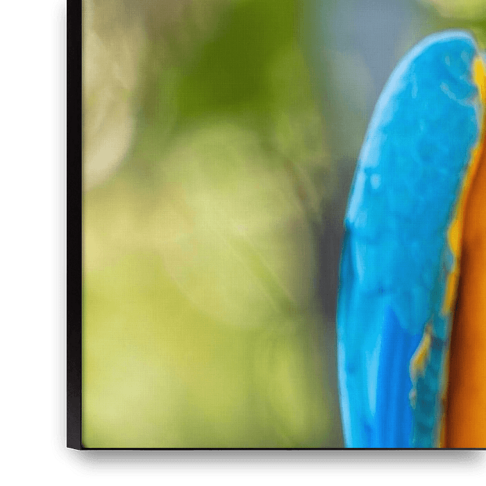 What do you see in the artwork? A stunning close-up portrait of a Blue-and-Yellow Macaw. The colours are spectacular: a bright blue on the head and wings that fades into a deep, saturated yellow on the body. The white, featherless cheeks with black lines frame the eye perfectly. The powerful black beak holds a small piece of food,…