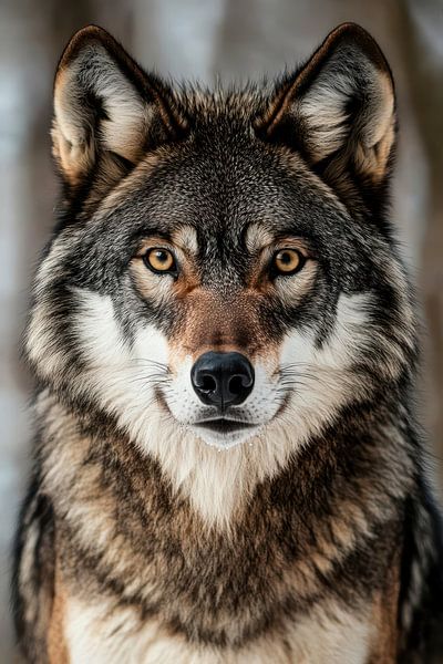 A frontal portrait of a wolf shows a symmetrical head with intensely amber eyes, framed by a rich fur texture. The sharp muzzle and soft ear tips contrast with a calm, hazy forest background, creating depth and tranquillity. Neutral brown and grey tones are subtly lifted by warm highlights around the eyes. The composition is tightly…