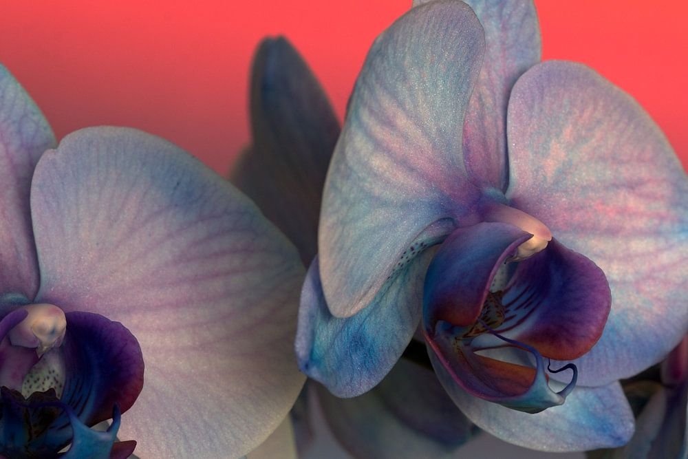 About "Closeup of a lilac pink orchid against a red-blue background"