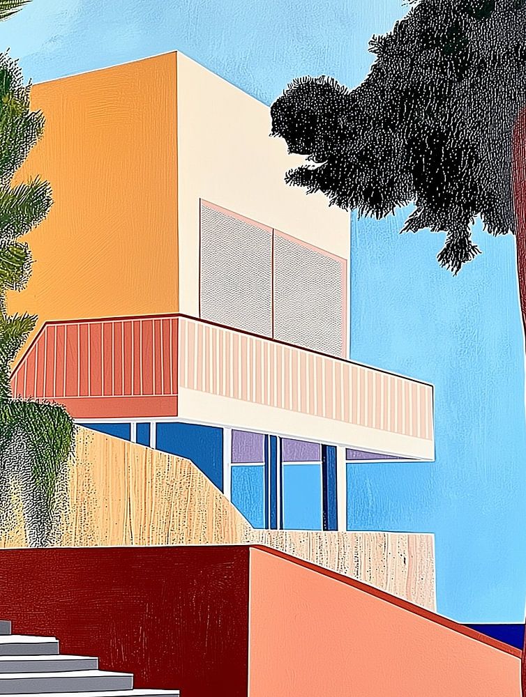 Coastal Serenity from the 'Tranquil Architecture' series is a composition that combines architectural forms and timeless stillness. The work shows a structure designed with clean lines and subtle symmetry, set in a hushed, almost surrealistic environment. The soft pastel shades enhance the sense of tranquillity and bring a dreamy atmosphere to life.