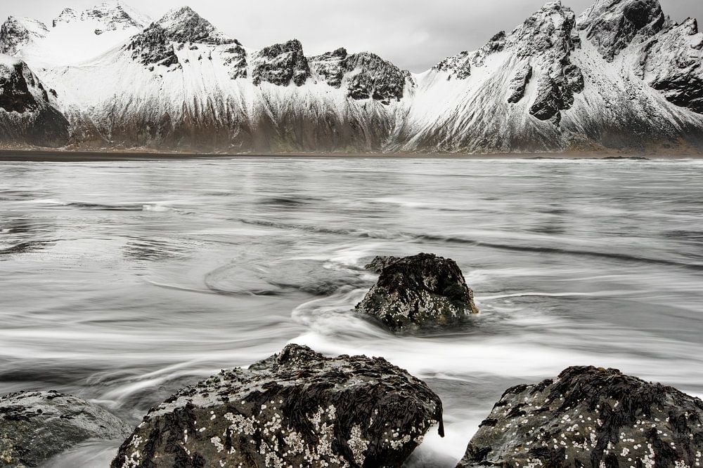 I was particularly impressed by this location. In the foreground the large stones surrounded by water, then the wide bay in which the waves steadily run up on the black lava sand beach and in the background the majestic mountain range. All this offered an imposing impression, which I have captured in this picture.