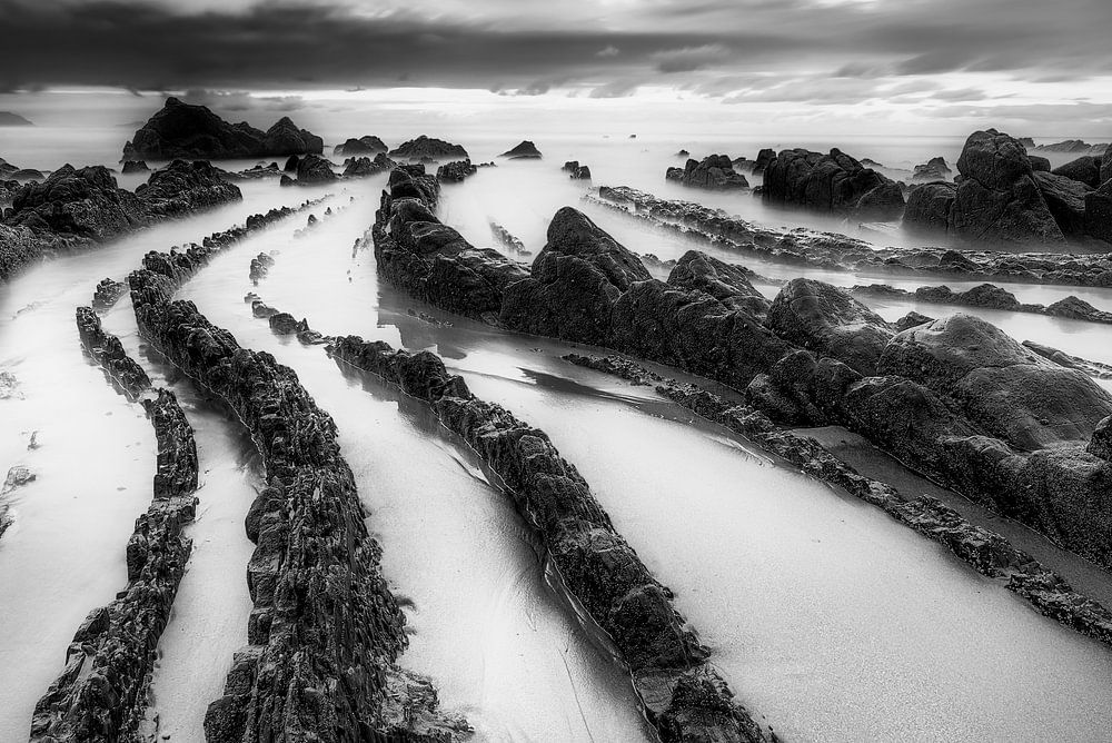 The rocks running in gentle arcs along the beach in the direction of the sea are particularly impressive in the evening after sunset in the evening light. On this quiet evening there was in addition a dramatically shining sky, which is quite typical for this landscape in northern Spain.