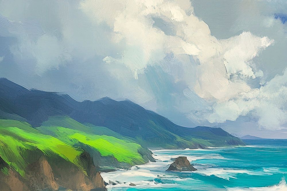 A breathtaking coastal landscape unfolds in vibrant shades of green and shimmering blue, where gentle waves meet rocky shores. The dramatic clouds add a dynamic touch to the scenery. This picture could fit perfectly in a living room, where it can stimulate relaxing conversation and inspiring thoughts.