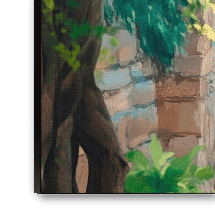 A dreamy view through a picturesque alleyway, lined with blooming bougainvillea and light-flooded houses, exudes Mediterranean flair. The soft blue of the sea harmonises perfectly with the warm earth tones of the architecture, ideal for a living room that wants to radiate calm and inspiration. Bring that holiday feeling right into your home!