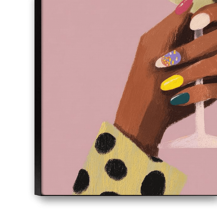 Cocktail Time, a fresh cocktail. This artwork is pure thirst-quenching merriment on canvas. With slices of fruit and popping nail polish, this is no ordinary drink, but a happy hour for your wall. Perfect for those who could use a little summer, style and sparkle every day. Cheers to that!