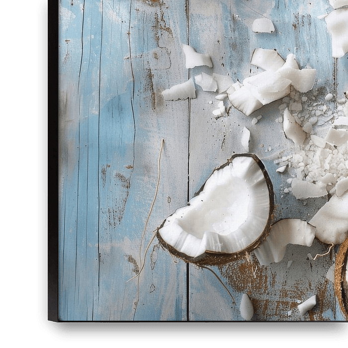 Broken coconuts lie in partially open shells on a rustic, bluish wooden surface. Delicate coconut shavings and fresh, shiny flesh are scattered around them, making the picture look lively and inviting. The harmonious colours and natural texture create a tropical flair that enchants the viewer.