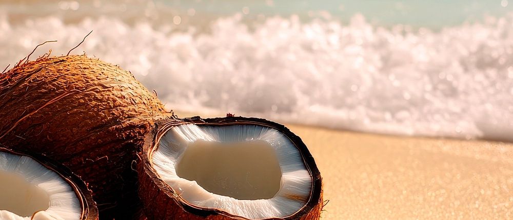Gentle waves play around the half-open coconuts, while the golden sand shimmers in the sunlight. The harmony of natural colours and the relaxing sea backdrop evokes holiday memories and wanderlust. Perfect for the kitchen, this picture brings tropical flair and a refreshing atmosphere to any room.