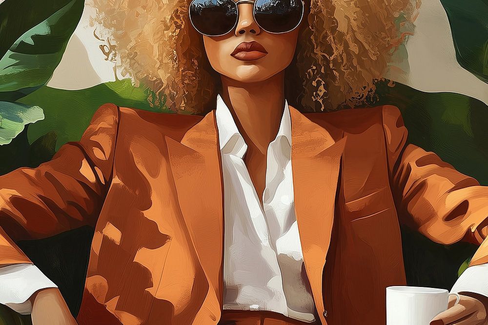 In a setting full of lush leaves and deep greens, a woman sits relaxed but powerful in her pose. The…