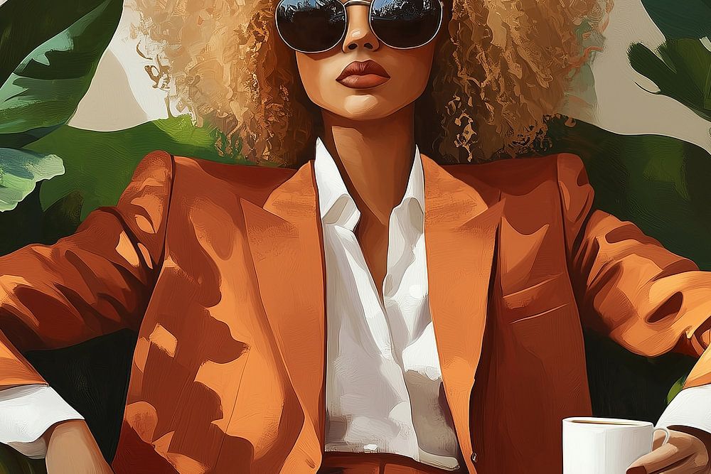 In a setting full of lush leaves and deep greens, a woman sits relaxed but powerful in her pose. The…