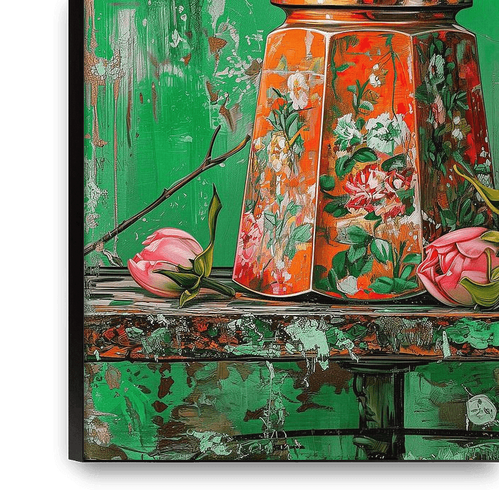 Painting of an orange flower-painted Italian Percolator (coffee pot). A cheerful and colourful still life in shades of green and orange. The coffee pot stands on a wooden tray next to pink roses and in front of a green.