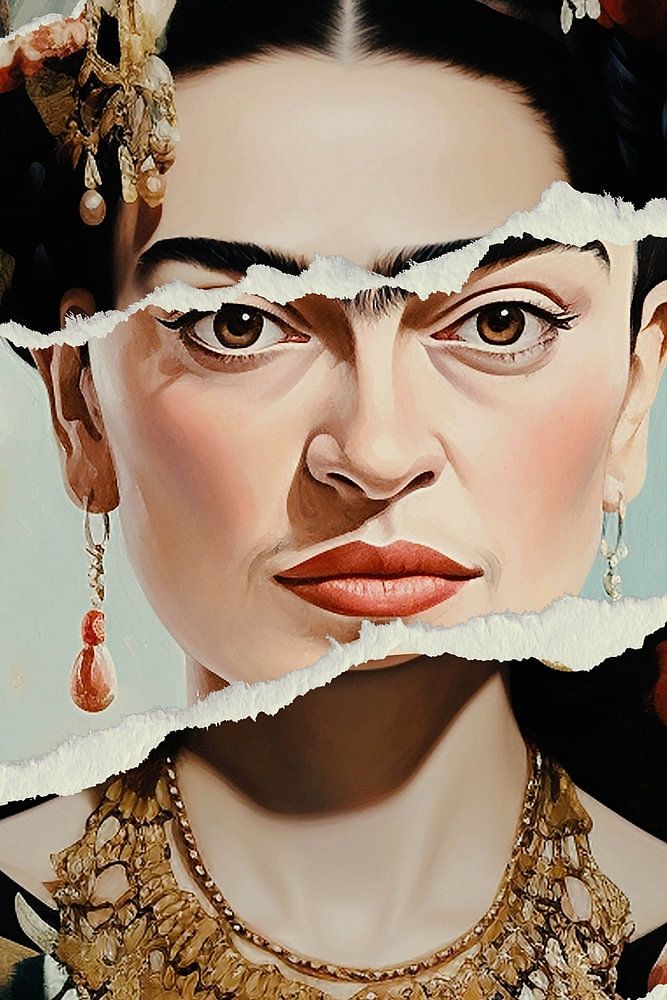 Frida wears traditional or ceremonial clothing and jewellery, and her gaze is intense and penetrating. The flowers in her hair and background are lush and rich in colour, providing a vivid contrast to her stern expression. The artistic technique raises questions about identity and perception, and the way we sometimes see only fragments of the whole.