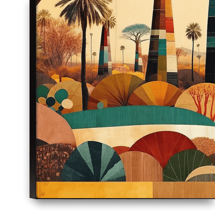Buy this landscape artwork Collage/composition of African landscape with baobabs by Lois Diallo on canvas, ArtFrame, poster and wallpaper, printed on demand in high quality.