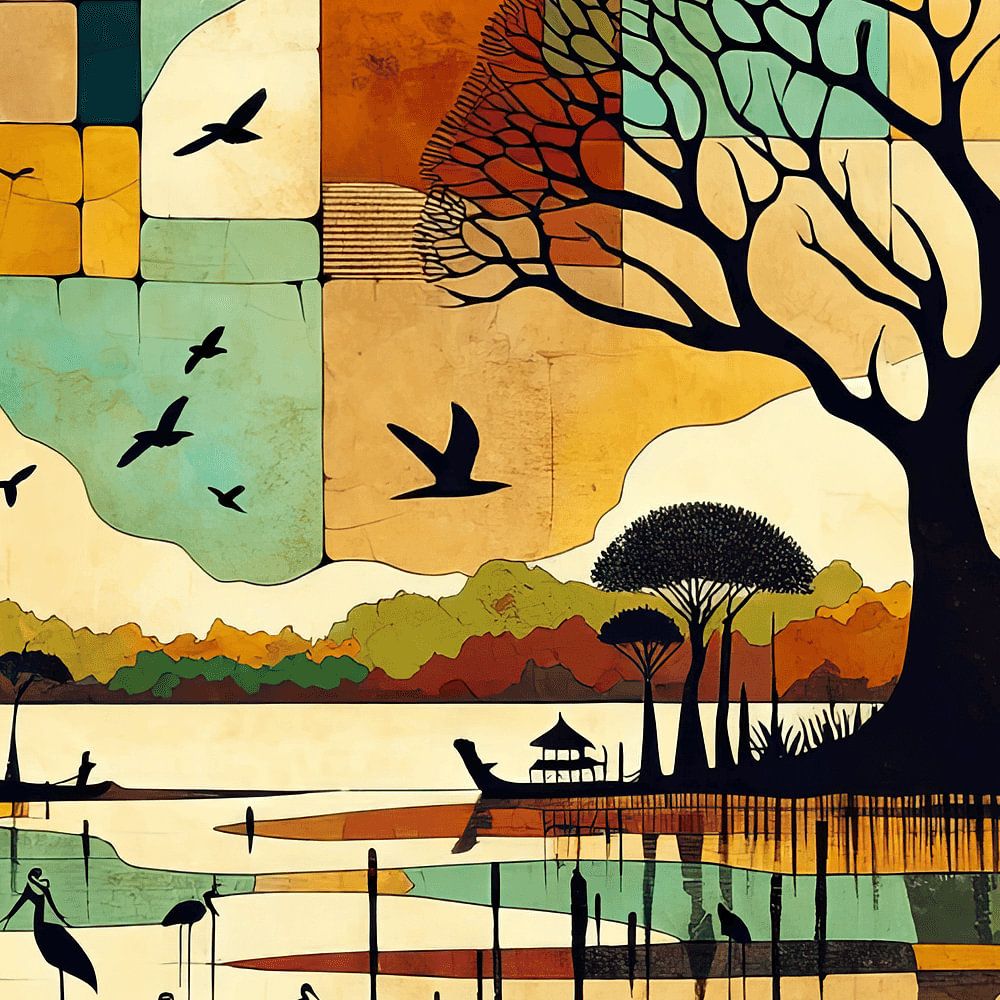 Collage created together with AI. Theme: Senegalese landscape with baobab trees and birds. Inspired by the Somone lagoon nature reserve. In this lagoon, you will find lots of (migratory) birds and fish. And for lovers: oysters galore!
