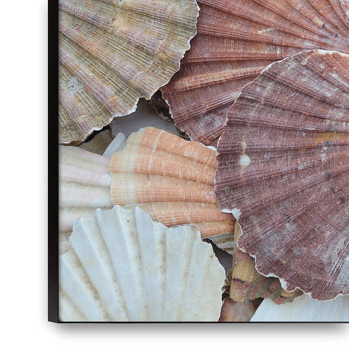 Photo of a collection of coloured scallops, on the beach near Port-en-Bessin-Huppain, in Normandy, France. The shell with a beautiful pattern is also called scallop or scallop shell.