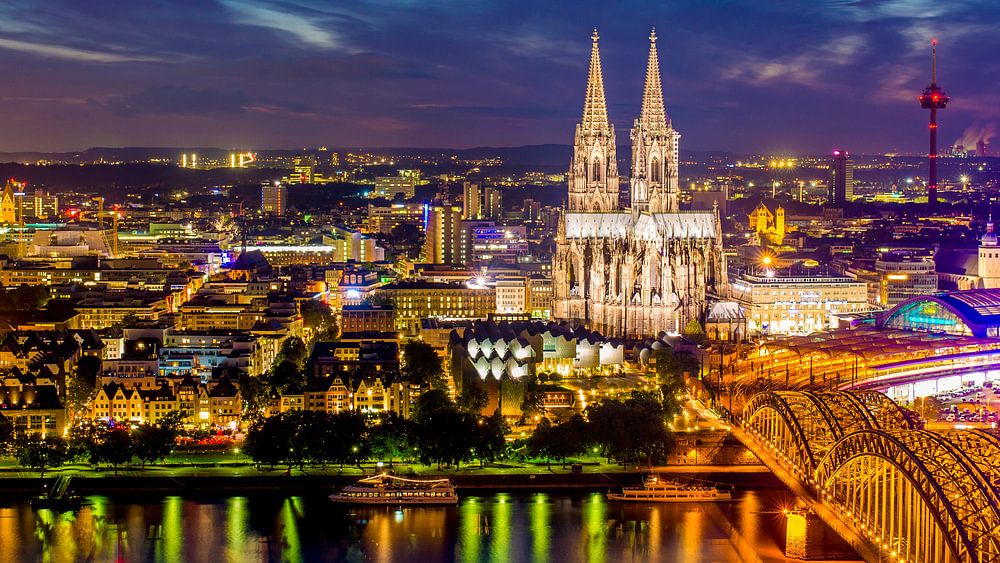 Cologne Cathedral at night, skyline of Cologne, Germany