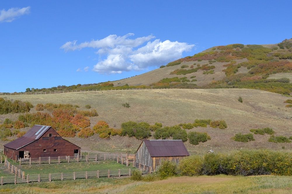 Jeep tour through and over the mountains near Ouray, Colorado, America. Barn and fencing add to the landscape.