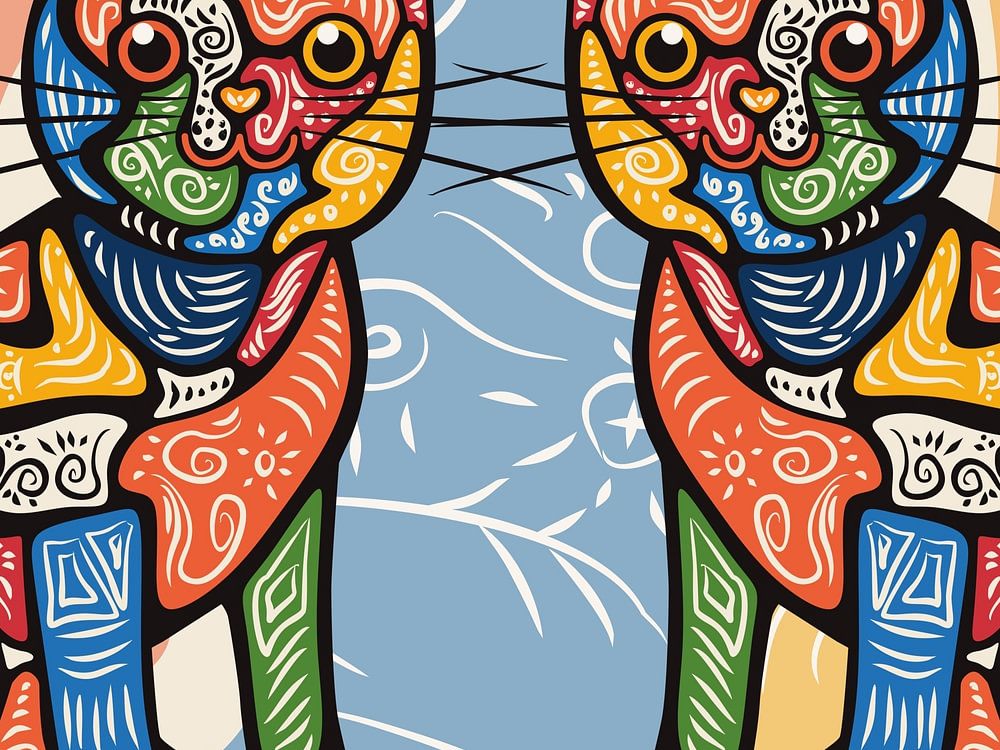 The image features two stylized cats facing each other, rendered in a vibrant and decorative style. Each cat is composed of various colorful segments, including shades of orange, yellow, green, and blue, all outlined in black. The background is divided into sections of pastel colors, including peach, light blue, and cream, adorned with swirling patterns.