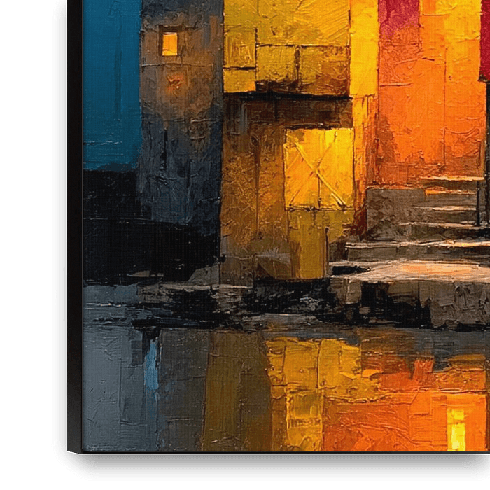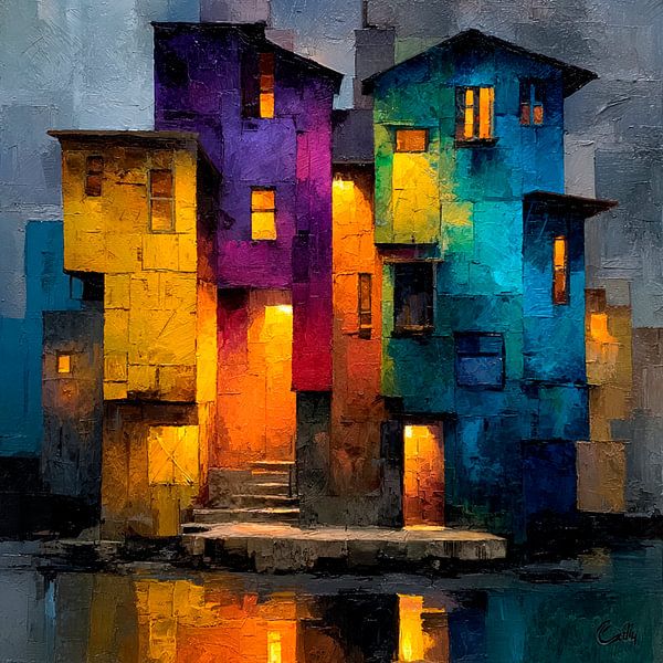 Brightly colored houses glow softly in the night. Reflections in the water enhance the dreamy atmosphere. Warm lights contrast beautifully with deep shadows. The painterly style adds emotion and charm. Perfect for cozy and contemporary living spaces.