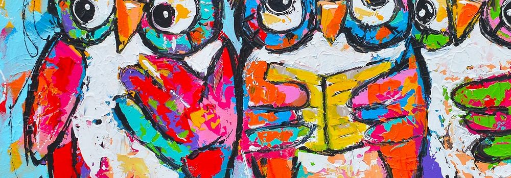 Buy this bird art Colorful Owls | Panorama by Vrolijk Schilderij on canvas, ArtFrame, poster and wallpaper, printed on demand in high quality.