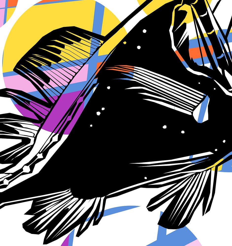 This black deep-sea fish belongs to the species Idiacanthus antrostomus. Kitty Bertelink used this fish as a source of inspiration for this painting. The background is colored and the fish is black. Orange, yellow, lilac and light blue are the colors.