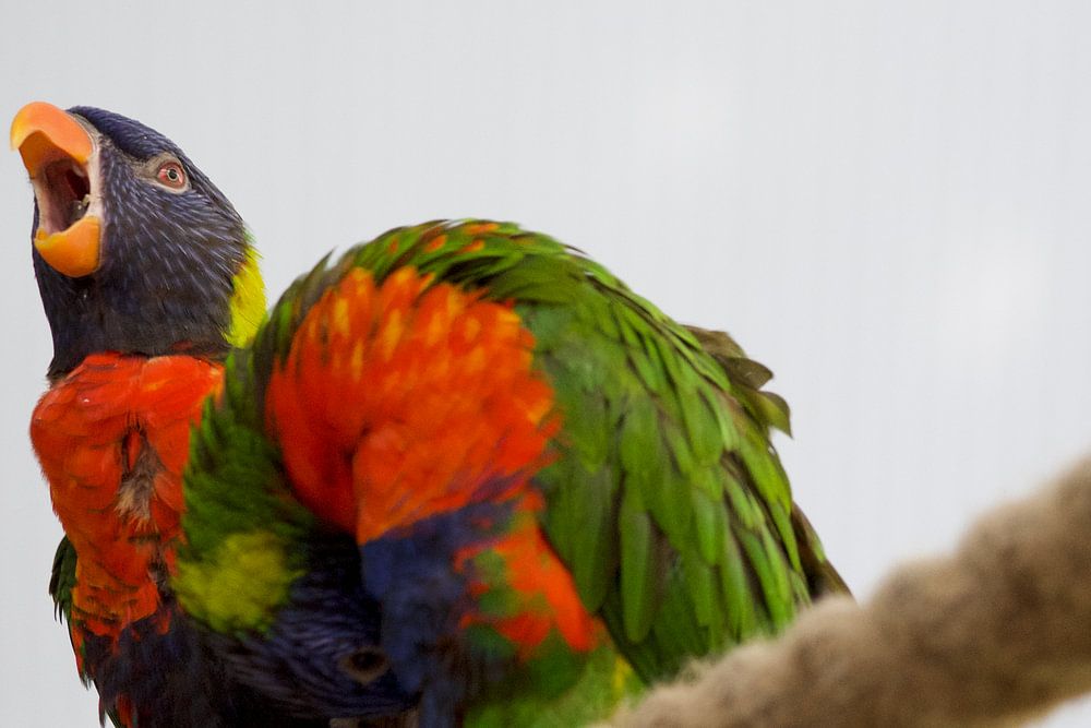 Two rainbow lorikeets perch on a rough-textured rope, their feathers exploding with greens, reds, blues, and yellows. One lifts its head to call out while the other burrows into its plumage, giving the scene a dynamic contrast between energy and tenderness.