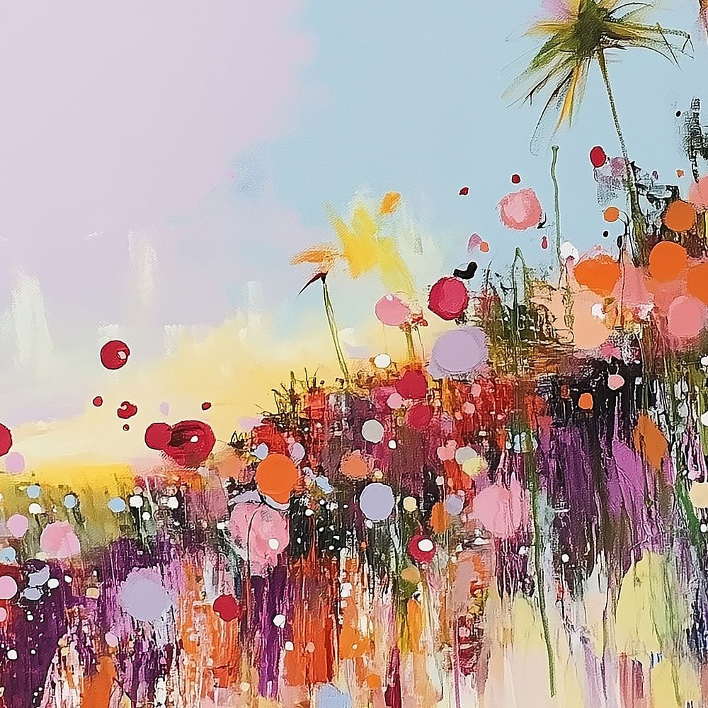 The palms sway rhythmically, like silent witnesses of an eternal summer day, while the flowers seem to rise from the canvas in an explosion of colour. The paint drips and flows, as if the colours themselves are breathing - ephemeral, vibrant and free.