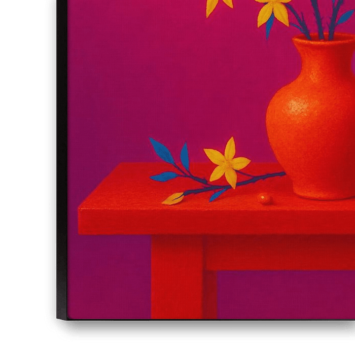 An expressive still life full of energy, in which a colourful vase and bright blossom branches combine to form a vibrant whole. The powerful hues - from deep pink to warm yellow and bright red - create dynamism without agitation. The composition remains refined and graceful, making this artwork a real eye-catcher in modern and creative interiors. An ode to colour, light and movement on the wall.
