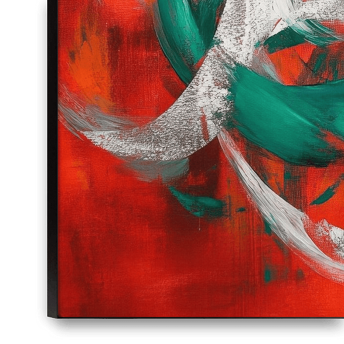 Vibrant streams of colour dance in passionate red, while curved shapes in cool turquoise and radiant white play harmoniously together. This dynamic composition lends an energetic atmosphere to any room and is particularly suitable for a lively living room, where it can stimulate conversation and encourage creativity.