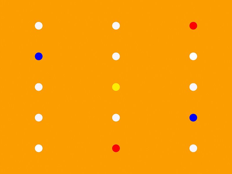 Digitally created image with different coloured dots on an orange background. Coloured dots in blue, white, yellow and red.