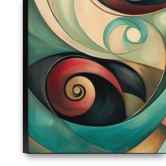 A fascinating interplay of curved lines and gentle colour gradients creates a harmonious dynamic. The deep greens and warm reds create an inviting atmosphere that radiates both excitement and calm. Perfectly hung in the living room, it transforms any room into a source of creative inspiration and serenity.