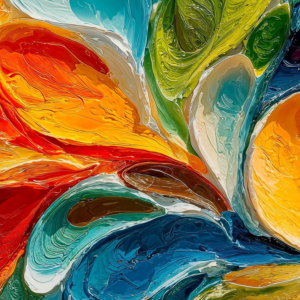 A vibrant, abstract acrylic painting with swirling, organic shapes resembling leaves, the composition consists of powerful, textured brushstrokes with a rich colour palette. The textured impasto technique emphasises the physical properties of the paint. The shapes are layered and intertwined, creating a sense of movement and depth.