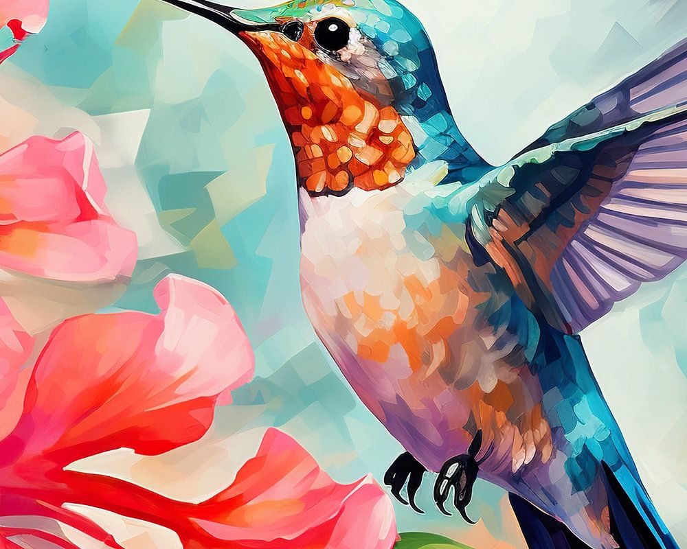 Colourful Hummingbird Dance | Abstract Hummingbird - This vibrant painting captures the essence of a hummingbird in flight, nestled against a background of variegated hues and blooming pink flowers. The use of geometric abstraction gives it a modern twist and creates a dynamic contrast between the hummingbird's natural fluidity and the sharp style of its surroundings. The colours are rich and varied, with a focus on turquoise, pink and orange hues that combine to create a warm and welcoming whole.