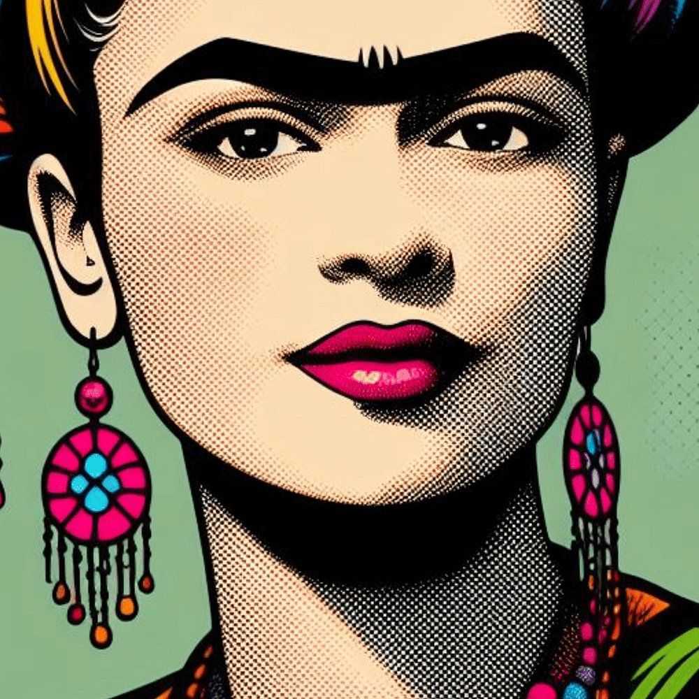 This painting is a vibrant reinterpretation of Frida's life and work in the style of pop art. It combines her famous self-portraits with an explosion of colour and pop culture elements, celebrating both her artistic legacy and her unyielding spirit.