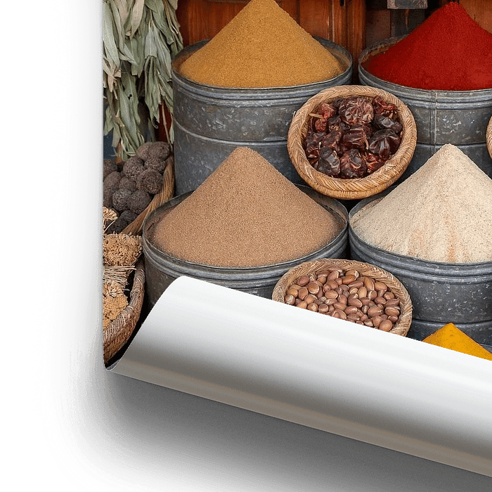 Spices, powder, soaps and other colourful objects in pots and baskets in the Souks of Marrakech in Morocco.