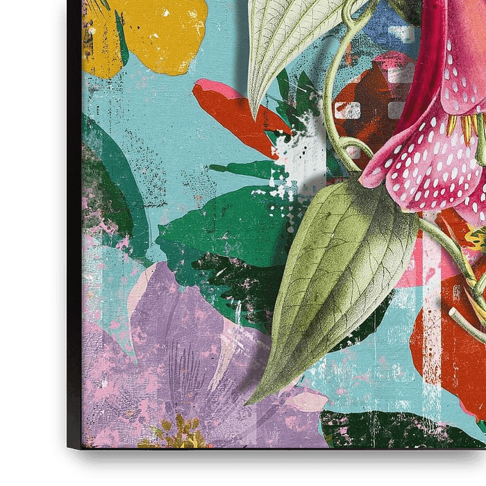 This artwork is a dynamic collage that combines classic botanical illustration with modern, abstract street art.