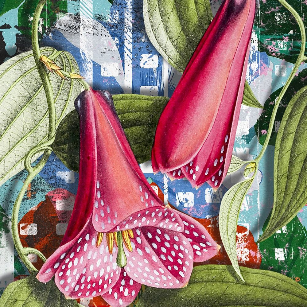 At its centre is a detailed vintage image of a Lapageria rosea, also known as the Chilean bellflower. This classic representation contrasts sharply with the background, which consists of a layered, explosive mix of…