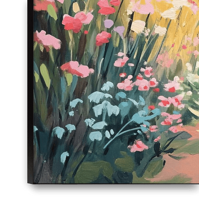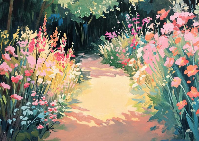 Colourful Path Among Flowers - This garden painting depicts a beautiful path surrounded by colourful flowers in shades of pink, yellow and white, creating a cheerful summer atmosphere that invites you to stroll through the garden.
